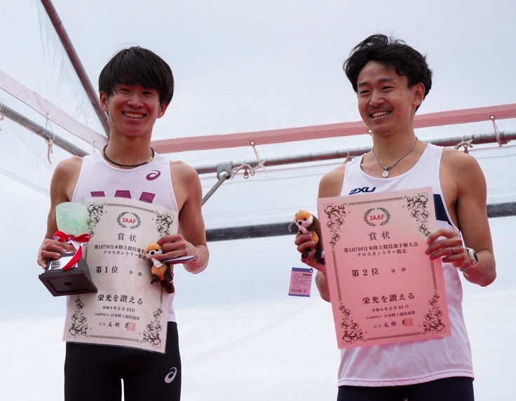 本日、福岡県で第107回日本選手権クロスカントリーが行われ、山口智規(2年)が見事優勝しました!前半から先頭集団でレースを進め、ラストはOBの井川龍人(令和5年卒)とのデットヒートを制しました。これにより、世界クロスカントリー日本代表ならびに、日本選手権10000mの出場権を獲得しました。
