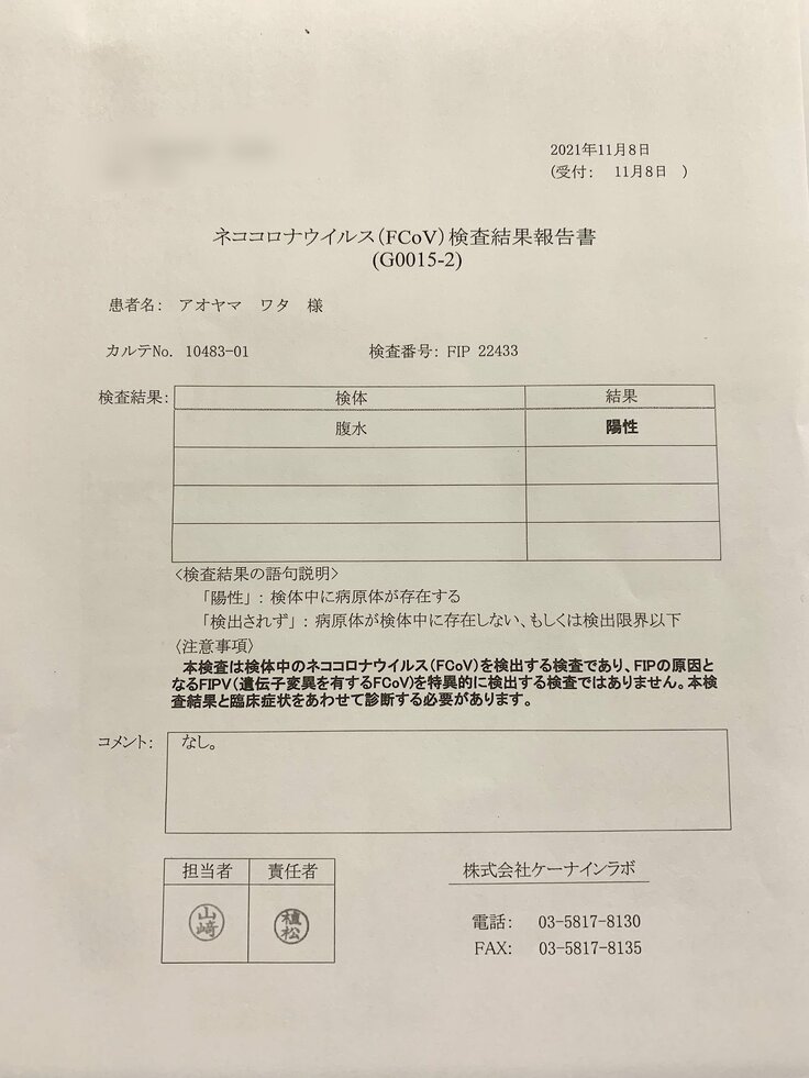 夕方に病院へ行き、初日に行ったFIPの検査結果が渡されました。やはり陽性でした。