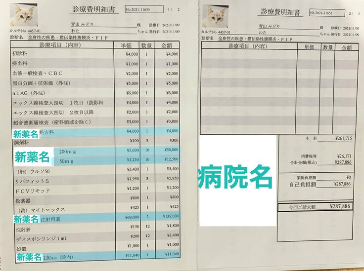 FIPを発症したわたを救うためには、現在行っている新薬の投与を84日間毎日行う必要があります。具体的な治療費の試算を書かせていただきます。