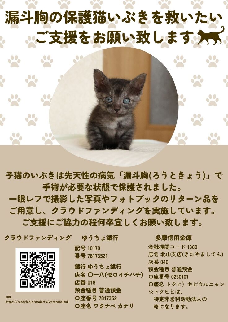 漏斗胸(ろうときょう)の保護子猫いぶきの手術費用を集めるクラウドファンディングに挑戦中です。
