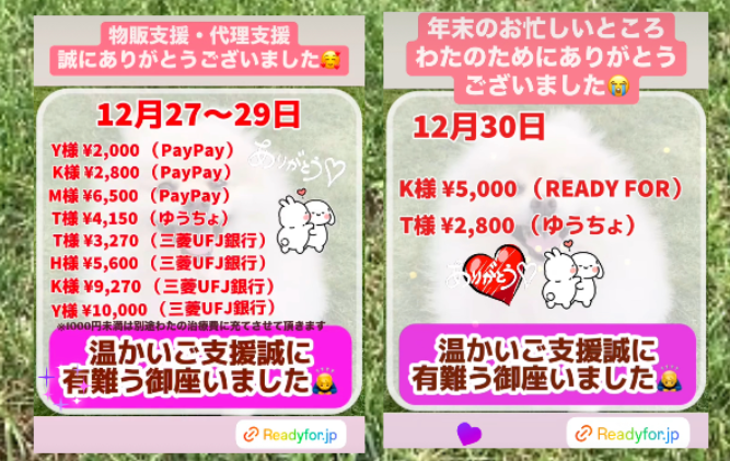 私がダウンしている間にもいろいろな方がご支援、拡散をご協力して頂き本当に嬉しかったです
