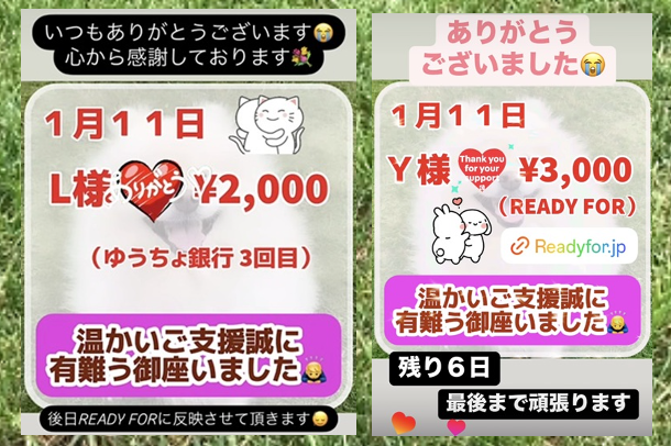 大変心苦しいのですが、日々の治療費など稼ぐことでリターンにかけられる資金がない為、写真付き感謝のメールと活動報告のみでご理解いただけると幸いです。