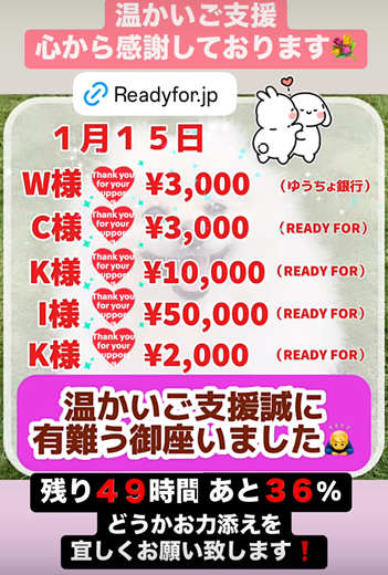 大変心苦しいのですが、日々の治療費など稼ぐことでリターンにかけられる資金がない為、写真付き感謝のメールと活動報告のみでご理解いただけると幸いです。
