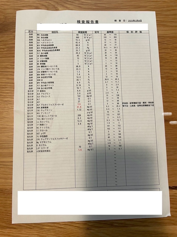 術後の経過は問題がなく、すこぶる順調とのことでした。検査報告書の数値が高いところもありますが、以前よりはだいぶ下がってきています。
