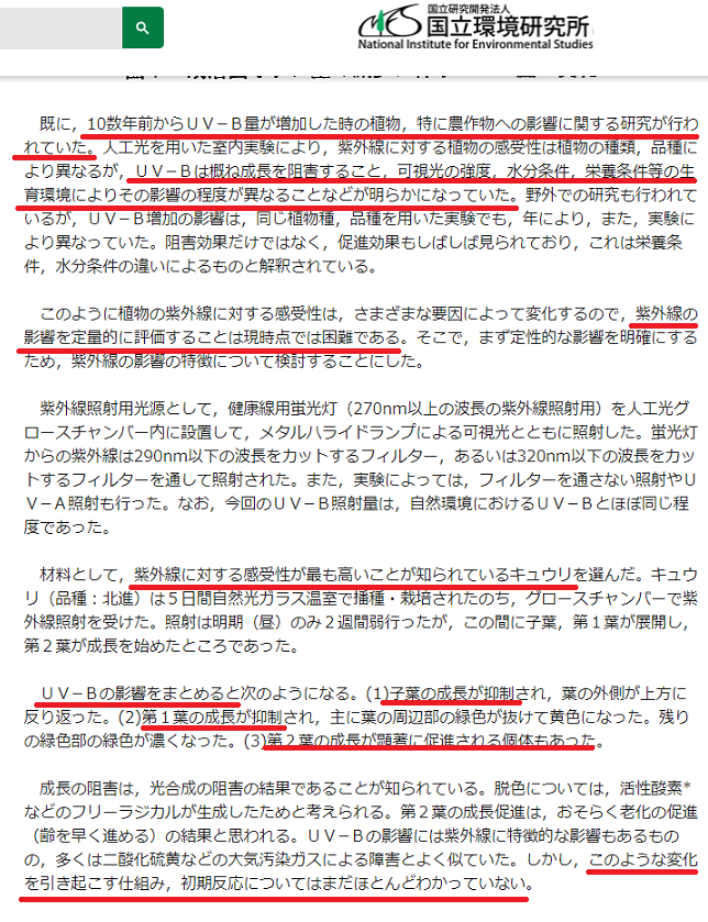 出典元:国立環境研究所/Courtesy of NIES 特別研究活動の報告「紫外線による植物の成長阻害」より抜粋