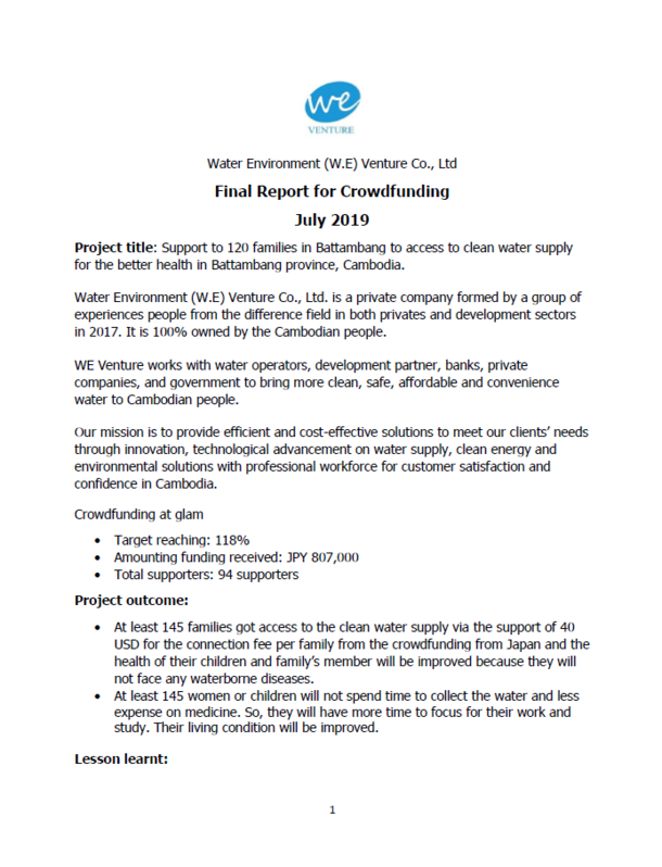 このクラウドファンディングプロジェクトを通して、WE Ventureの活動を広めてくれる世界中の様々な人々に会うことができました。多くの日本企業との提携も進み、CSR活動としての支援も得ることができました。さらに、クラウドファンディングについて改めて理解が進み、新たなクラウドファンディングプロジェクトへの挑戦の意欲を得ました。なぜなら、まだまだ多くのカンボジアの人々が清潔な水を得ることができない状況が続いているからです。