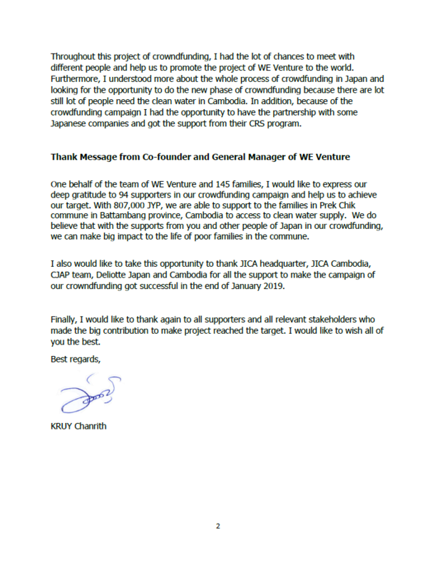 WE ventureと145世帯の家族を代表して、94名のサポーターの皆様には、目標を達成できたことに深い感謝の意を申し上げます。807,000円ものご支援により、カンボジアバッタンバン地方のPrek Chik地区に住む家庭に、清潔な水を届けることができました。我々は、クラウドファンディングにご協力いただいた皆様の ご支援により、その地区に住む貧困世帯に大きなインパクトを残せたと確信しています。