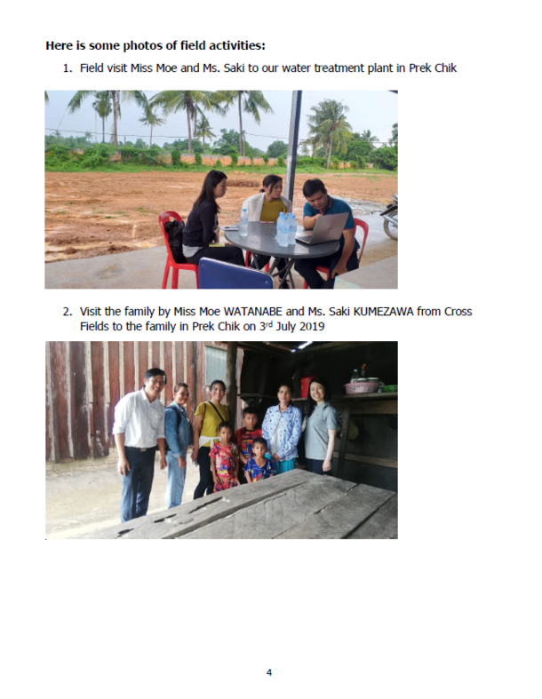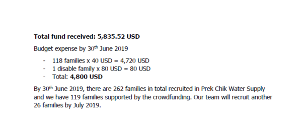 2019年6月30日までに、262世帯にPrek Chik 地区の水道供給事業における水の供給を募集し、クラウドファンディングによって 119世帯を支援しました。また、26 世帯の追加支援を2019年夏中に募集します。