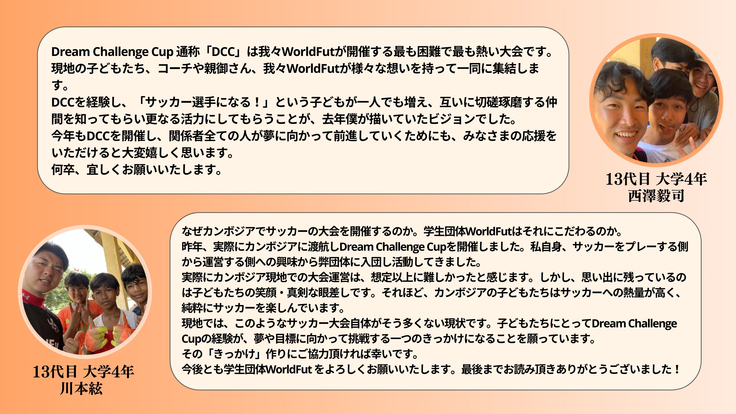 学生団体WorldFutがカンボジアにてDream Challenge Cup 6th を開催する。集まった資金は、参加チーム交通費/参加チーム昼食代/会場費/通訳雇用費/救護班雇用費/審判代に使用させていただきます。