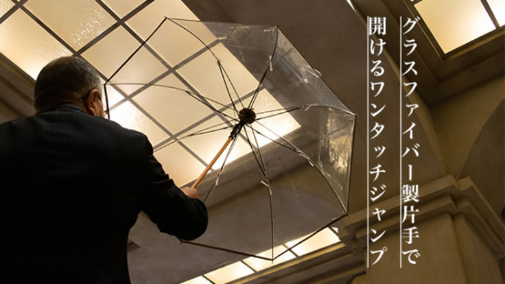開くと竹のように跳ね上る60cm8本骨、椿手元(プロジェクト限定仕様)のワンタッチ透明傘