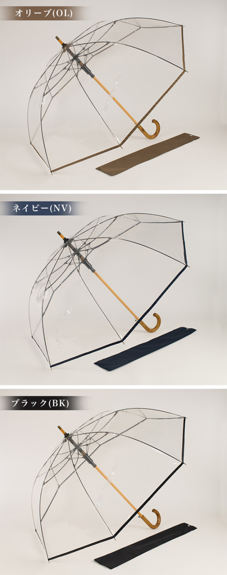 完全透明は樹脂フィルム素材でしか未だに実現できません。繊維ではまるで目の前にカーテンをぶら下げて歩いている状態で、視界の悪い雨天ではますます危険です。しっかりしたグラスファイバー骨を使用した修理の出来る透明傘を、5年、10年とご利用いただきたいのです。