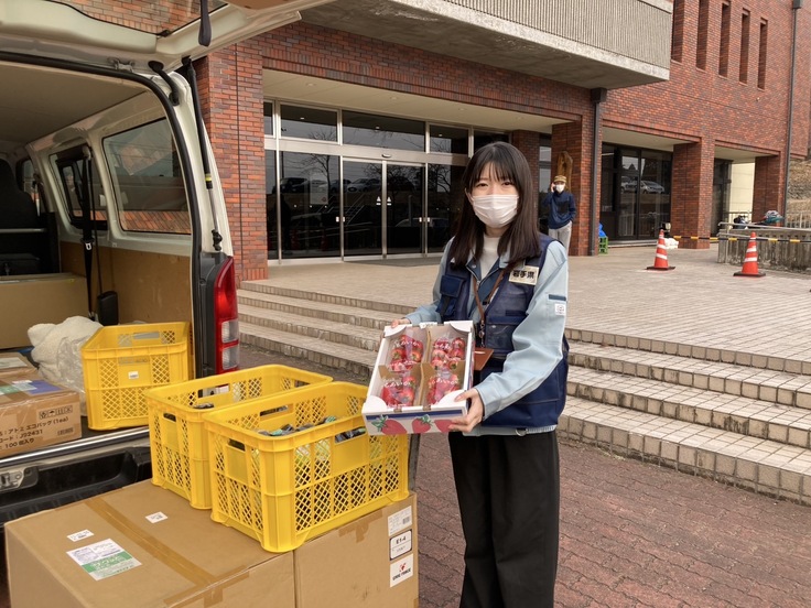 「市から提供される弁当や炊き出しを出しているが、生鮮品はなかなか食べられていない。フレッシュなイチゴはとてもありがたい」。そう笑顔で話してくれたのは公民館の館長さん。避難所運営に携わる市の職員の方によれば、イチゴは4日の夕食の際に避難者の方に配られたとのこと。婦人部の皆さんが協力して仕分けをしてくれました。