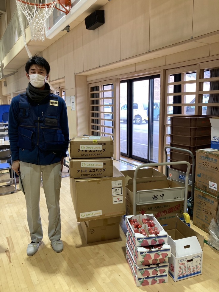 2月28日から大船渡の避難所などを回って支援活動を続けるCivic Forceスタッフは4日、三陸公民館でイチゴ56パックと仕分け用の紙コップ300個、靴下42足、ミニコンテナ2つをお届けしました。