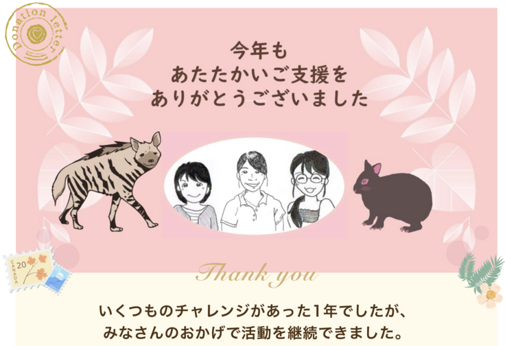 今年もあとわずか。みなさまのご支援で野生生物保全に取り組むことができました。厚く御礼を申し上げます。