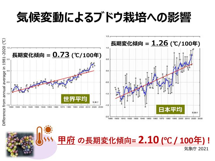 世界平均では100年で0.73度、我が国の平均では100年で1.26度、平均気温が上昇しています。対して、ワイン科学研究センターが所在する甲府市では、平均気温が100年で2.1度も上昇しています(気象庁 世界の年平均気温)。
