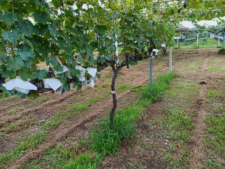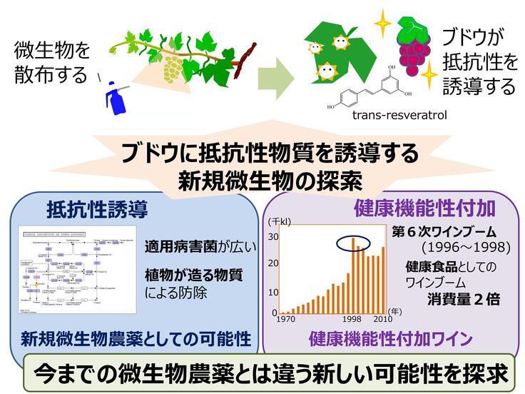 日本の気象環境(高温多雨)やワイン用ブドウは露地栽培されることを考えると、とても厳しいビジョンです。シン・山梨大学ワインプロジェクトでは、有機栽培推進に向けたブドウ栽培へ挑戦します。雨を避ける栽培システム、病害虫に抵抗性をもつ品種の育種、新規微生物農薬やバイオスティミュラント※の開発など技術・栽培体系を学生たちと開発します。