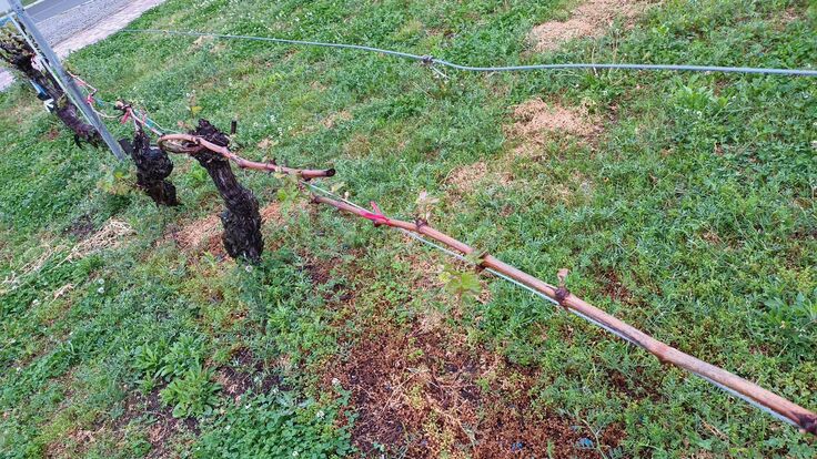 ワイン科学研究センター前庭の圃場の様子:晩生のカベルネ・ソーヴィニヨンがようやく萌芽