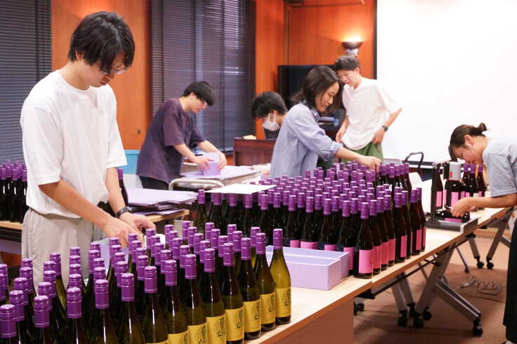 学生たちと共に一本一本丁寧にラベルを貼り付ける作業は、単なる仕事以上の意味がありました。若い世代がワイン造りに関する作業工程を学ぶ姿は、まさに本プロジェクトが目指すものです。このラベルには、学生たちの情熱、そして皆様の温かいサポートが詰まっていると自負しております。学生たちも、支援者の皆様への感謝の気持ちを込めて、細心の注意を払って作業に取り組みました。