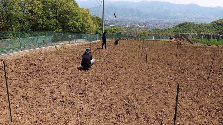 初めての測量に挑む学生も多く、巻尺や杭を手に、地形を読みながら畝の配置や支柱の位置を慎重に確認していきました。