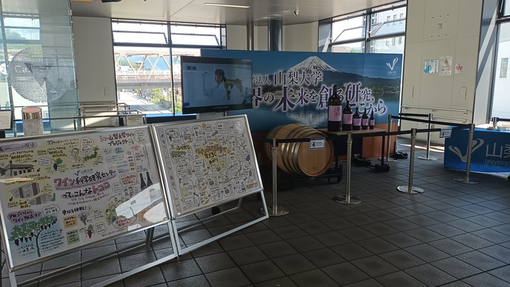 現在、8月1日より、JR甲府駅ペデストリアンデッキ(改札横の広場)にて、山梨大学ワイン科学研究センターの展示を行っております。改札を出てすぐ、どなたでもご覧いただける場所です。
