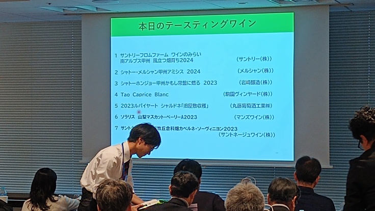 弊センター岸本先生、榎先生、山梨県果樹試験場の新谷先生による講演の後は、参加者の皆さまお待ちかねの「テイスティング講座(講師:サントリー庄内先生)」です。