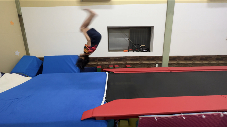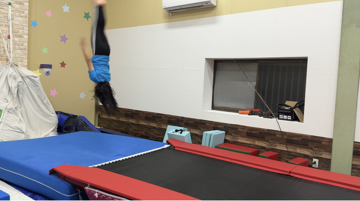 普段はこういった難しい技の練習は【タンブリングトランポリン】というトランポリンで跳躍の助けを借りて練習します。