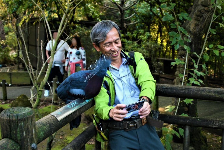 ▲ ズーラシアのバードケージでオウギバトと過ごす村田先生