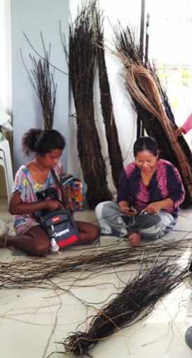 フィリピンで日常的に使われているツル草の植物、ニトを集めて、一つのツルを3つに裂きます。伝統的な柄の中布も準備します。