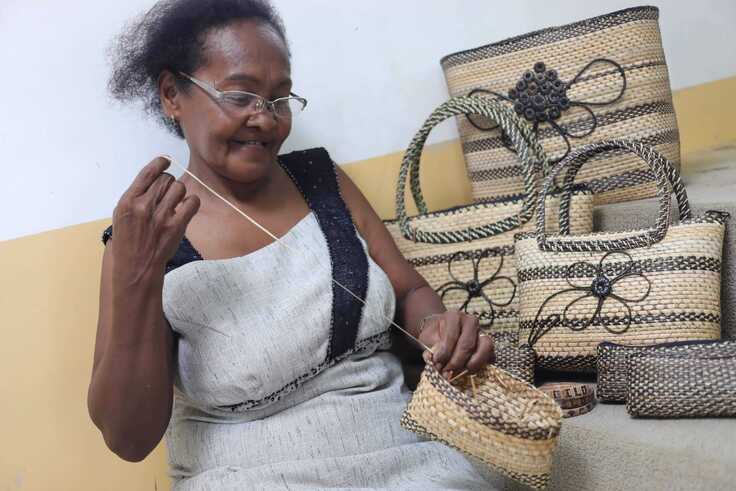 生産者メンバーは、20~50代の先住民の女性達が丁寧に編み込んで行きます。中布は手縫いで付けます。