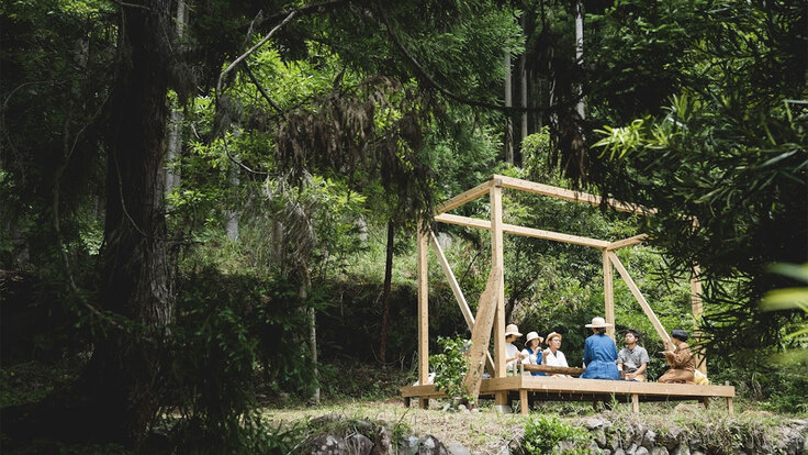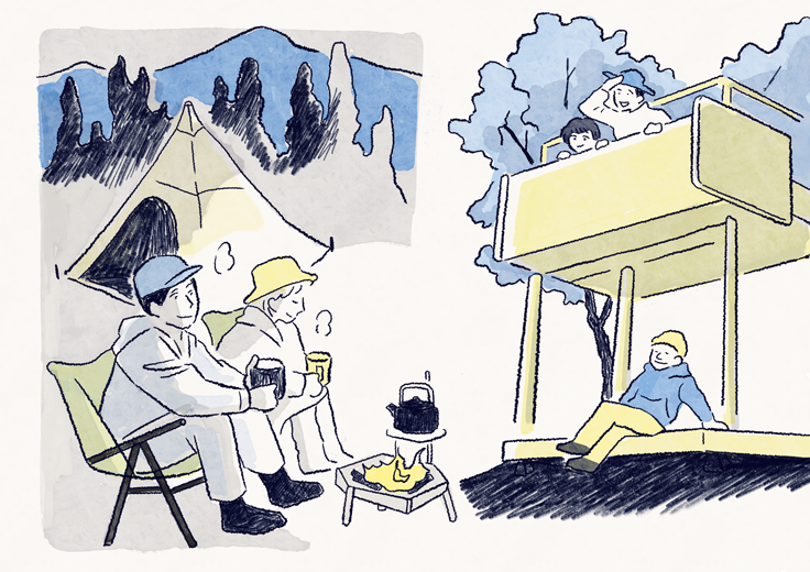 〈山耶 Yamaka〉には、地域の木材でつくった、自然の中にたたずむための「みはらし台」を建設し、公開します。キャンプや自然体験のアクティビティなどを提供します。