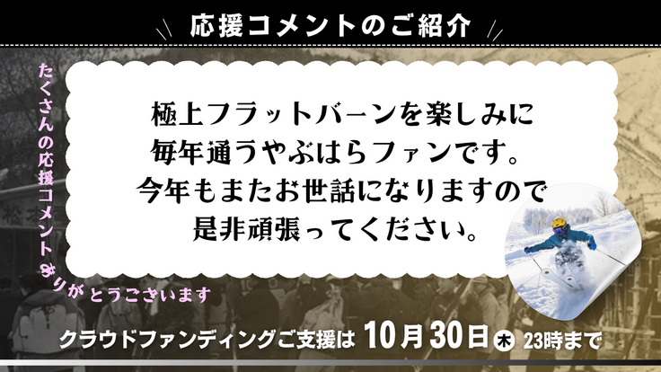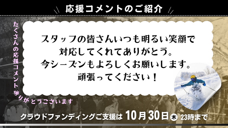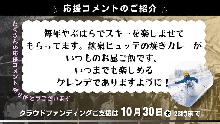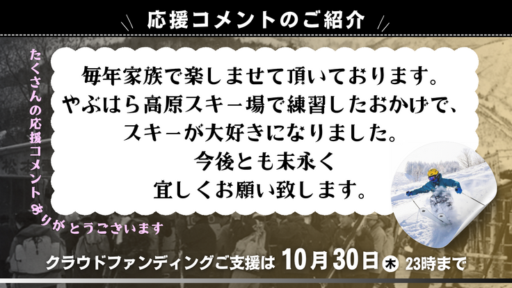 皆さまからの「やぶはら高原スキー場」への熱い想いを受け止め、関係者一同、最後まで力を尽くしてまいります。