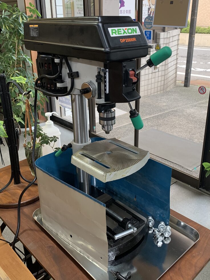 回転するドリル部分をハンドルで昇降させて穴をあける機械です。