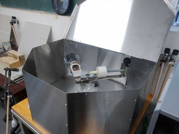 遠心力を利用して溶けた金属を鋳型に流し込む機械と、その保護カバーです。