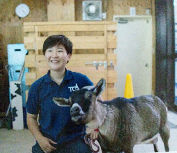 そして、専門学校時代に、今の私に繋がる大きな出会いがありました。それが、専門学校の飼育動物ヤギの「まめ子」との出会いでした。「まめ子」は学内でも人気者で、学校のお祭りであるアニマルショーにも出演する芸達者な子。犬のように芸をトレーニングすれば出来るようになるなんて…その意外性から私はヤギに興味を持ちました。また、まめ子を通じて同じくヤギが好きな同級生や先輩後輩との出会いもあり、私の人生に「ヤギ」が登場しました。