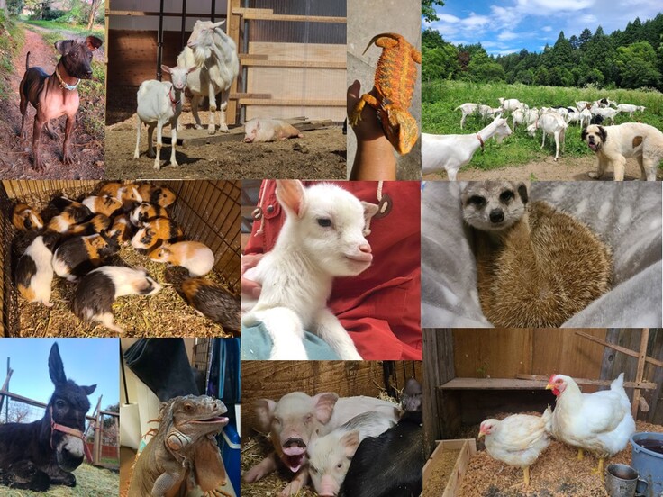 今現在では始めた当初より動物の種類や数が増え、現在は総数200匹ほどの動物と暮らしています。引き取った動物には、片目が見えないポニー、初老のロバ、妊娠したミニブタ、山に捨てられた元猟犬や、大きくなりすぎて手に負えなくなったセントバーナード等。本当にたくさんの動物たちがいます。