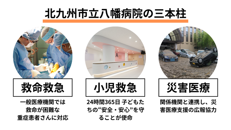 北九州市立八幡病院は北九州市の「救急の砦」として、小児救急をはじめとする地域の救急医療を支えています。また、災害拠点病院でもある当院では、災害時にはDMAT(災害派遣医療チーム)を被災地に派遣し、北九州市を超えて全国へ医療を届ける使命を担っています。