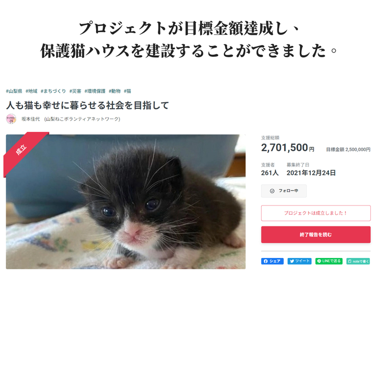 クラウドファンディングで猫ハウス建設のプロジェクトを掲げ、無事成立。
