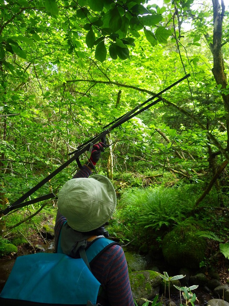 発信機調査も実施できました。重さ1グラムほどの発信機を装着した個体を2023年から継続して追跡することができました。アンテナを持ってどこにヤマネがいるかを探ります。