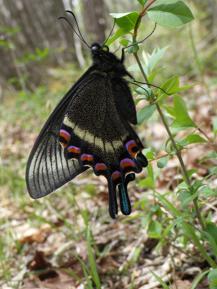 林床の草にミヤマカラスアゲハが停まっている。