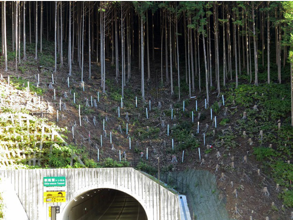 高速道路のトンネル坑口付近で伐採された場所に、ヤマネの餌となる樹木を児童たちが植栽しました。