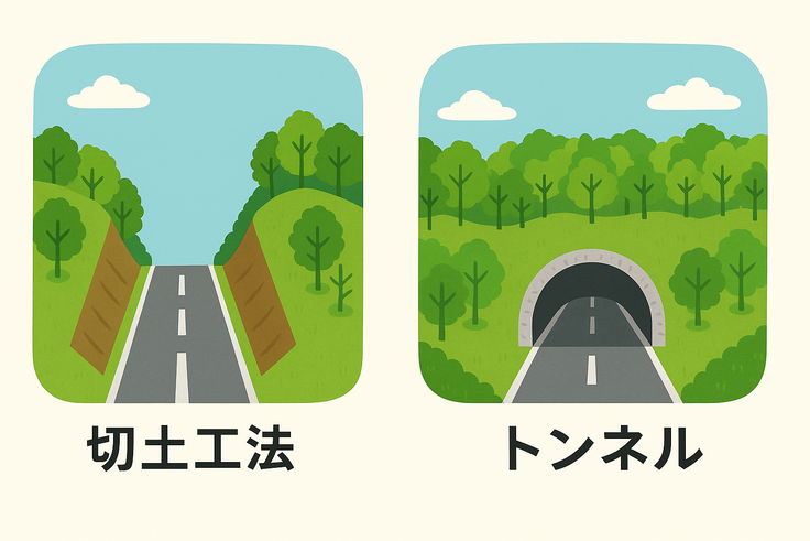 有料道路建設にともない、森の土と樹をまるごと除去する「切土工法」の計画に対し、わたしたちは「トンネルにしてはどうか」と提案しました。