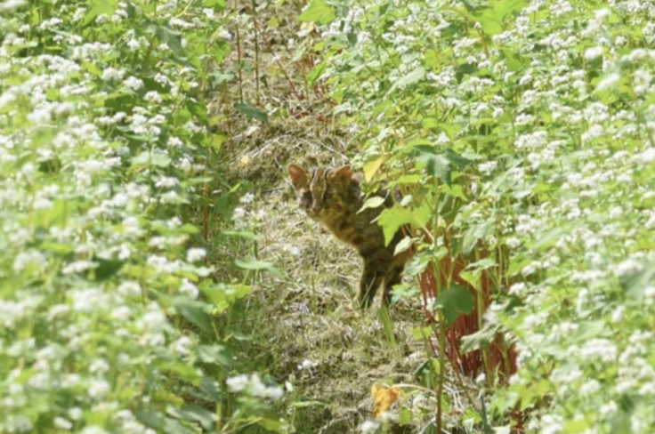 今回は最後に、山村名誉会長が撮影した、そば畑から顔をのぞかせるツシマヤマネコの姿を載せておきます。