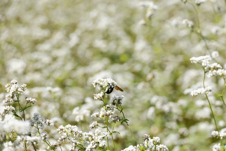 …というわけで青海では、しっかり検証して設置した防除柵が、イノシシやシカに突破されることも今のところ無く、青海のそば畑は現在花が満開!昆虫の楽園になっているようです。ねこりんからは遠くからも白く咲きほこる青海の画像と、真っ白な花の画像が届いています。