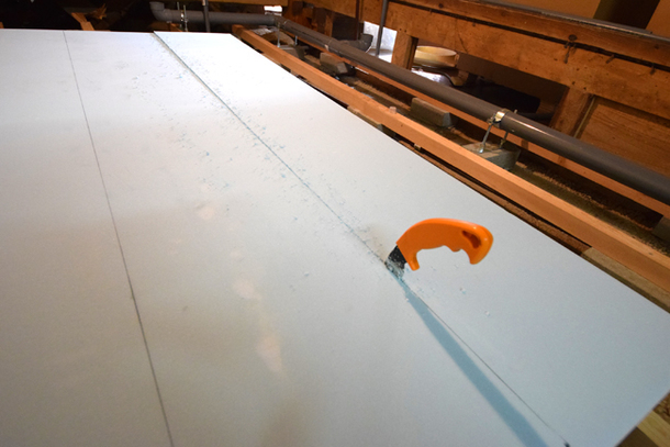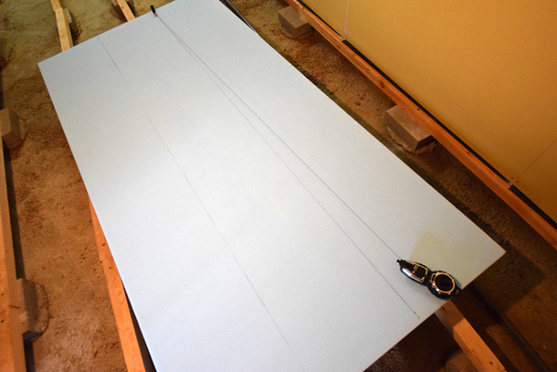 グラスウールをカットするときは、カットしたい位置に長い定規みたいな