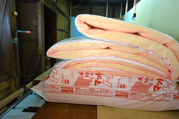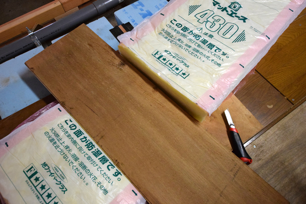 んで、木材との間に入れていくわけですが、グラスウールが大きいので