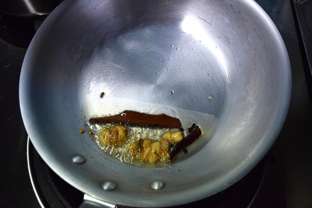 まず油に、シナモン・クローブ・ブラックペッパー・鷹の爪・ニンニクを加え