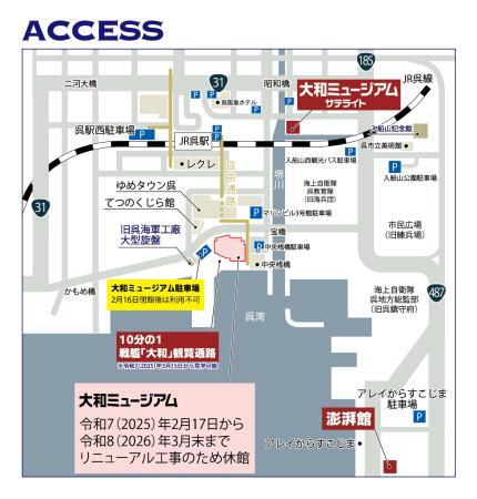 大和ミュージアムはリニューアル工事に伴い,令和7年2月16日(日)をもってリニューアル休館いたします。なお,仮展示室の開館日及び1/10戦艦「大和」観覧通路の供用開始日については次のとおりです。
