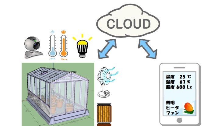 建物全体の設計は幅約4m×奥行約6m×高さ約4m。管理できる屋内施設(幅約3m×奥行約5m)が必要で、そこにはカメラ、温度・湿度・CO2濃度などの各種センサを設置して屋内施設の環境を観察します(実際の写真)。 その状態に応じて、ボイラをたいたり、換気扇を回したり、ミストを吹いたり、水をやったり、照明を点灯させたりします。これを専用サイトでインターネットを通し、見られるようにします。ボイラの燃料にはBDFも使用します。