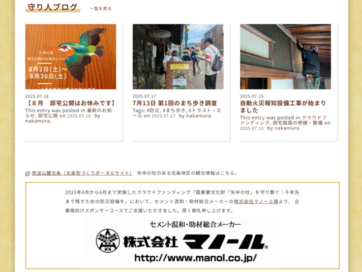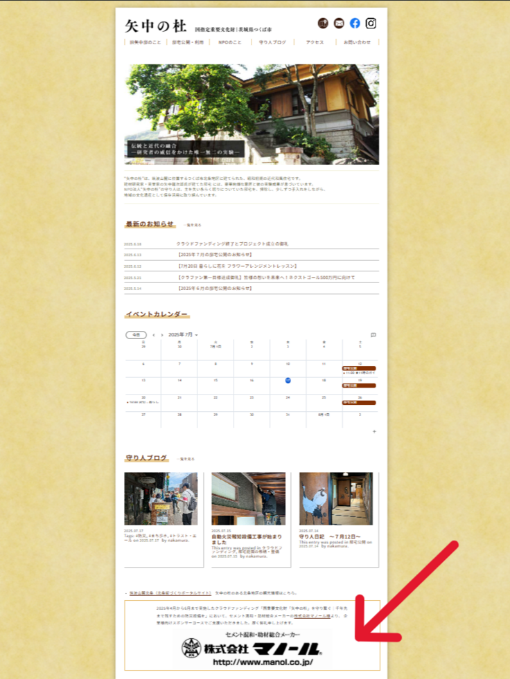 「スポンサーコース」リターン:株式会社マノール様の企業名と企業ロゴと矢中の杜HPに掲載しました