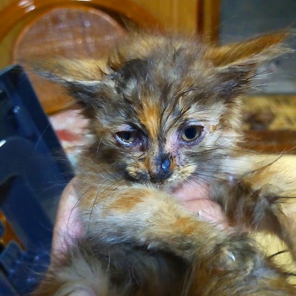サビ系の長毛、たぶん女の子。体重390g。目立った外傷はなし、ノミ・ダニ、真菌、疥癬、目の炎症と軽度の猫風邪の可能性。当方でマラセブシャンプー、レボリューション、目、鼻軟膏塗布の応急処置。お目々は最初の画像で心拍でしたが、とりは大丈夫かな。